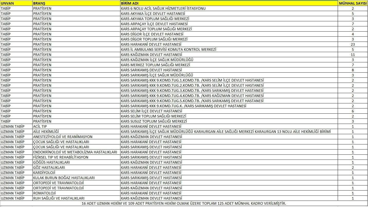 Yapılan planlamaya göre: 16 Uzman Hekim, 109 Pratisyen Hekim olmak üzere toplamda 125 yeni hekim, Serhat şehrimiz Kars’ta görevlendirilecek.