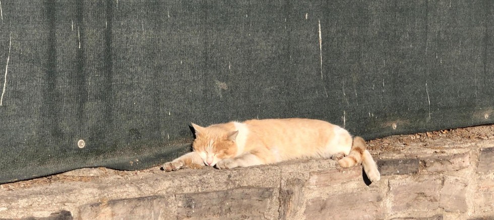 Öğrencilerin ve vatandaşların yoğun olarak geçtiği okulun duvarında, güneşin tadını çıkararak yatan kedi, çevresinden geçenlere aldırış etmeden dinlenmeye devam etti. Rahat tavırlarıyla dikkat çeken sevimli kedi, hem güneşin hem de huzurun tadını çıkardı.
