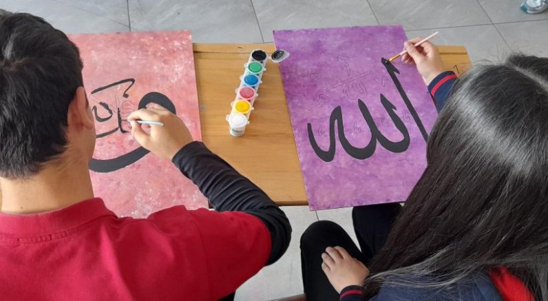 Kars 15 Temmuz Şehitler Anadolu Lisesi öğrencileri Görsel Sanatlar Öğretmeni Mehmet Doğan rehberliğinde geleneksel Türk el sanatlarından biri olan hat sanatını yaşatıyorlar.
