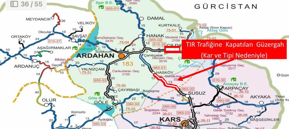 Kars Valiliği'nden yapılan açıklamaya göre, "Kars-Ardahan Yolu'nun Susuz-Hasköy arası yoğun kar yağışı ve tipi nedeniyle ağır taşıt trafiğine geçici olarak kapatılmıştır." denildi.