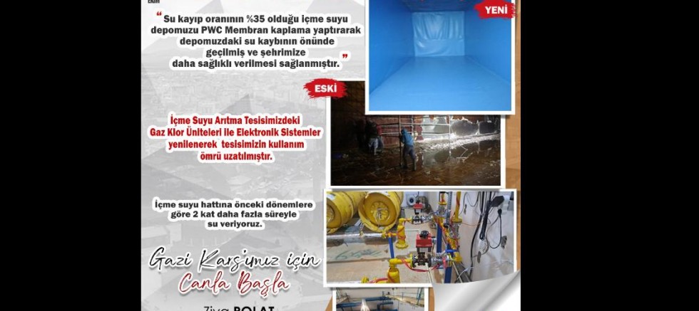 Yapıldığı tarihten bu yana herhangi bir bakım ve onarım çalışmasının yapılmadığı, içindeki fayans ve diğer kaplama malzemelerinin ömrünü tamamladığı için su kayıp oranın %35 olduğu içme suyu depomuzu PWC Membran kaplama yaptırarak hem depomuzda ki su kaybının önüne geçtik hem de şehrimize daha sağlıklı ve uzun saatler su verilmesini sağladık."