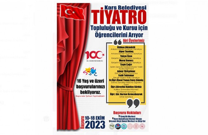 Tiyatro topluluğuna katılmak isteyen 16 yaş üzeri tüm vatandaşlar 10-18 Ekim 2023 tarihleri arasında Gençlik Merkezi, Aynalı Köşk Kültür Sanat Merkezi ve Kars Belediyesi Hizmet Binasındaki başvuru noktalarına şahsen başvuru yapacak.