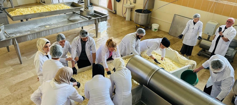 Öğrencilerin peynir yapımında kullanılacak sütün alınmasından itibaren başlayan mayalama, baskılama, telemenin fermantasyonu ve Kaşar peyniri kalıplama safhalarını yerinde görme imkânı sağlandı.