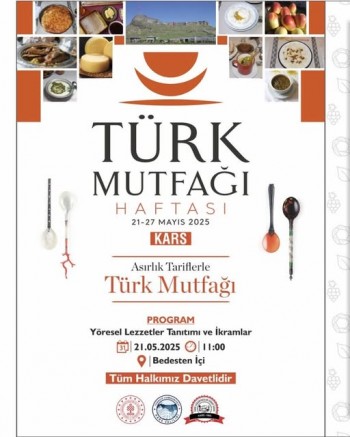 “21 Mayıs 2025 Çarşamba günü ilimiz Bedesten bölgesinde düzenlenecek olan Türk Mutfağı Haftası etkinliğimize katılımlarınızı arz ederim.”Kars’ın zengin gastronomi mirasını gelecek nesillere aktarmayı hedefleyen bu program, yerel mutfak kültürünün korunmasına ve tanıtımına büyük katkı sağlamayı amaçlıyor.