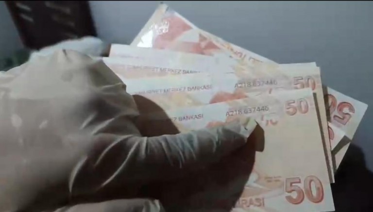 Yapılan aramada; kanepe yastığına gizlenmiş 5 farklı seri numarasına sahip 776 adet 50 TL'lik olmak üzere toplam 38 bin 800 TL sahte para, 2 parça halinde toplam 2,90 gram metamfetamin, 2 parça halinde toplam 0,97 gram bonzai, içerisinde metamfetamin bulaşığı bulunan şişe ve 2 cam aparat ele geçirildi.
