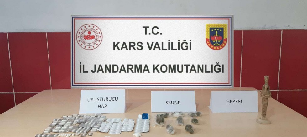 Kars İl Jandarma Komutanlığı ekipleri, yol kontrol ve arama noktasında durdurduğu bir araçta uyuşturucu madde arama köpeği Tabla ile yaptıkları arama yaptı. Araçta yolcu olarak bulunan K.Y.(40)’nin üst ve çantasında tarihi eser niteliği taşıyan insan figürlü heykel, 22 gram Skunk maddesi ile 106 uyuşturucu ve uyarıcı sentetik hap ele geçirildi. Gözaltına alınan K.Y.’nin işlemleri sürüyor.