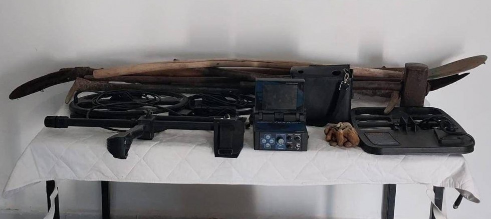 Şahısların kazıda kullandığı; 2 metal arama dedektörü ve aparatı, 1 dijital dedektör göstergesi ve çantası, 1 dedektör çantası, 1 balyoz, 3 kürek, 3 murç, 2 kazma, 1 çekiç, 1 inşaat eldiveni, ve 2 kova, ele geçirildi.