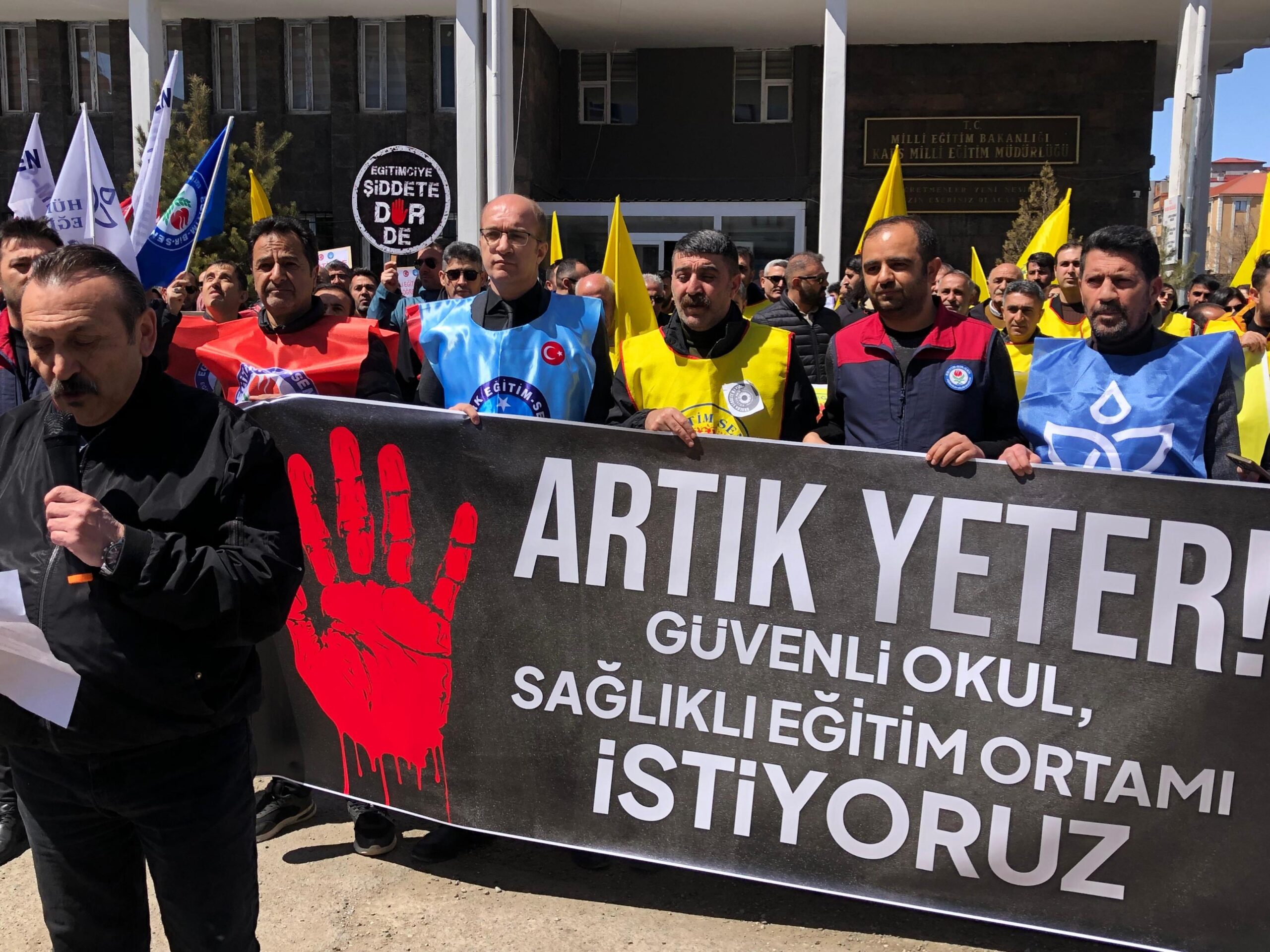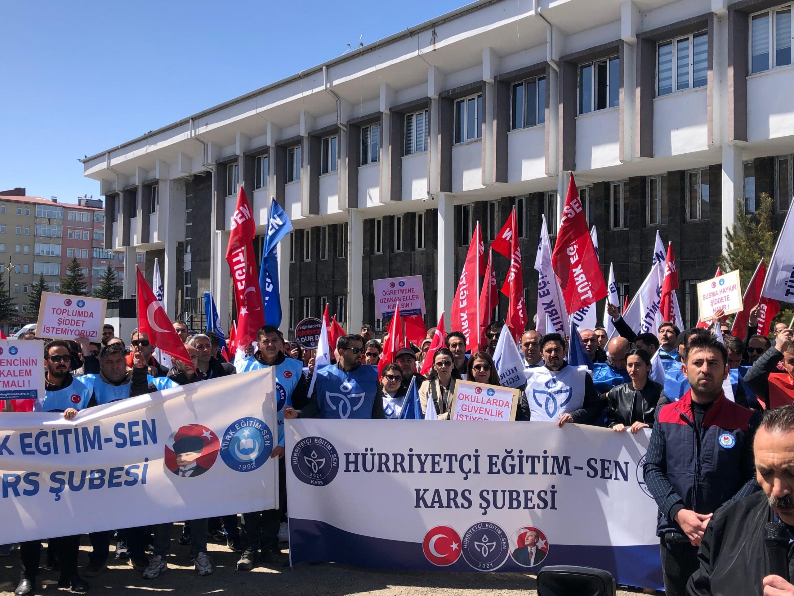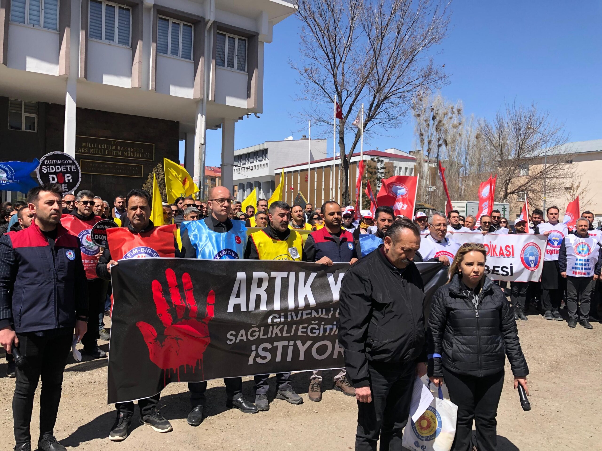 Kars İl Milli Eğitim Müdürlüğü önünde bir araya gelen sendika temsilcileri ve eğitim emekçileri, sloganlar eşliğinde okullarda artan şiddet olaylarını protesto etti. Basın açıklaması öncesinde hayatını kaybeden eğitimciler için bir dakikalık saygı duruşunda bulunuldu.