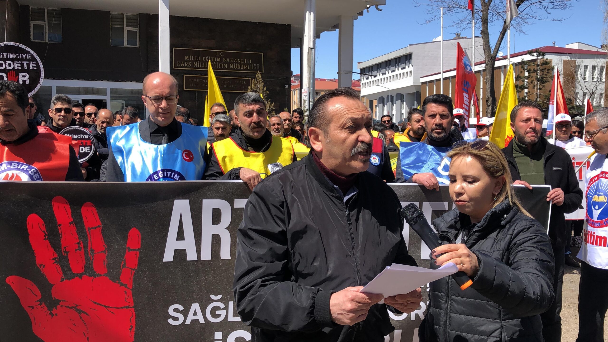 Olayın ardından Kars’taki eğitim sendikaları, bir günlük iş bırakma eylemi gerçekleştirerek basın açıklaması yaptı.