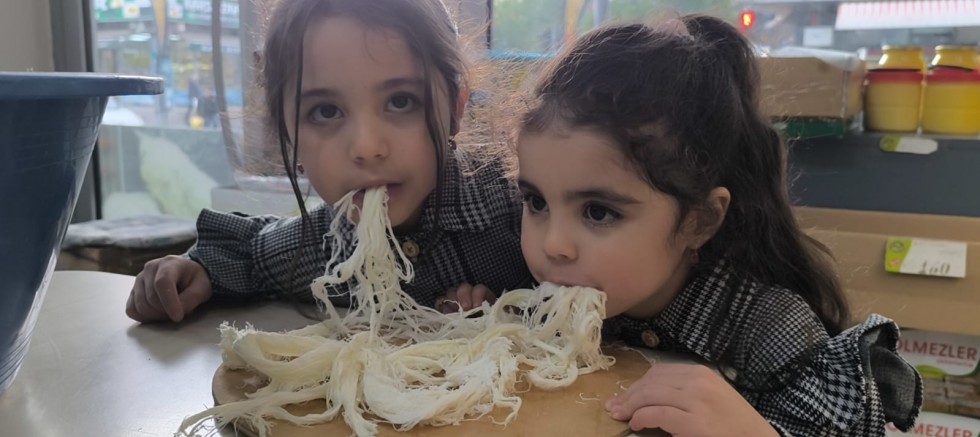 Kars'ta doğal köy peynirlerine olan sevgileriyle tanınan kız kardeşlerden Adel Naz ve Asel Asmin Özyağcı, babalarına ait şarküteriye her gittiklerinde Kars yöresine ait çecil peyniri, kaşar ve beyaz peyniri gönüllerince eğlenerek afiyetle yiyorlar.