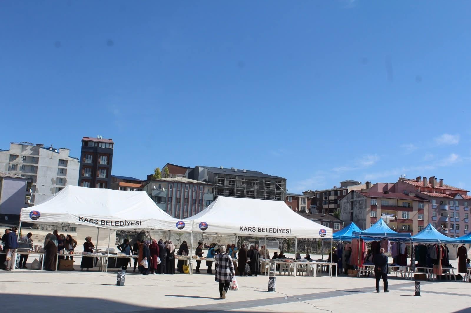 Kur'an Kursu Öğreticileri, TDV Gönüllüleri ve hayırsever vatandaşların katkılarıyla hazırlanan el emeği ürünler çarşıda satışa sunuldu. Elde edilen tüm gelir, Kars’taki Kur'an kurslarının ihtiyaçlarının karşılanması amacıyla bağışlanacak.