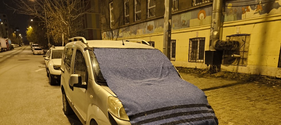 Bazı vatandaşlar halı ve battaniyelerle araçlarını soğuktan korumaya çalıştı.