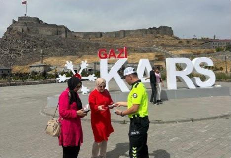 Kars İl Emniyet Müdürlüğü Trafik Tescil ve Denetleme Şube Müdürlüğü ekipleri tarafından, şehir merkezinin çeşitli noktalarında trafik güvenliğine yönelik farkındalık çalışması gerçekleştirildi.
