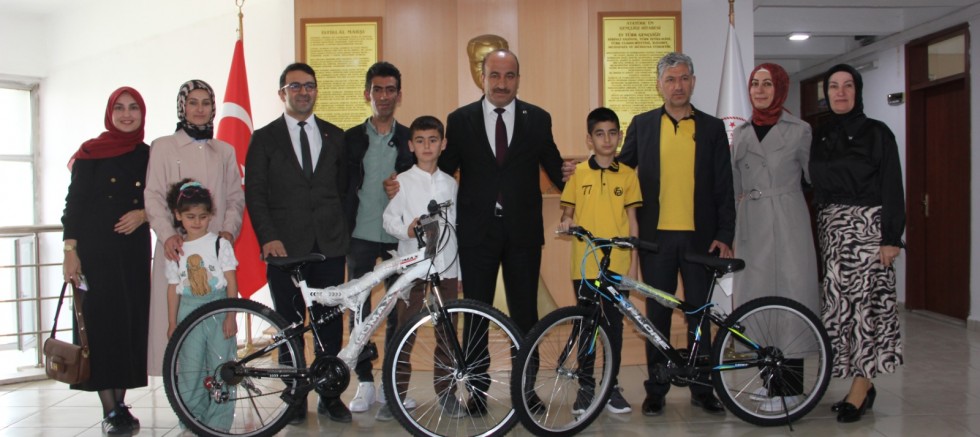 Milli Eğitim Müdürü Kaya, öğrencilere başarılarından dolayı tebrik ederek bisiklet hediye etti.