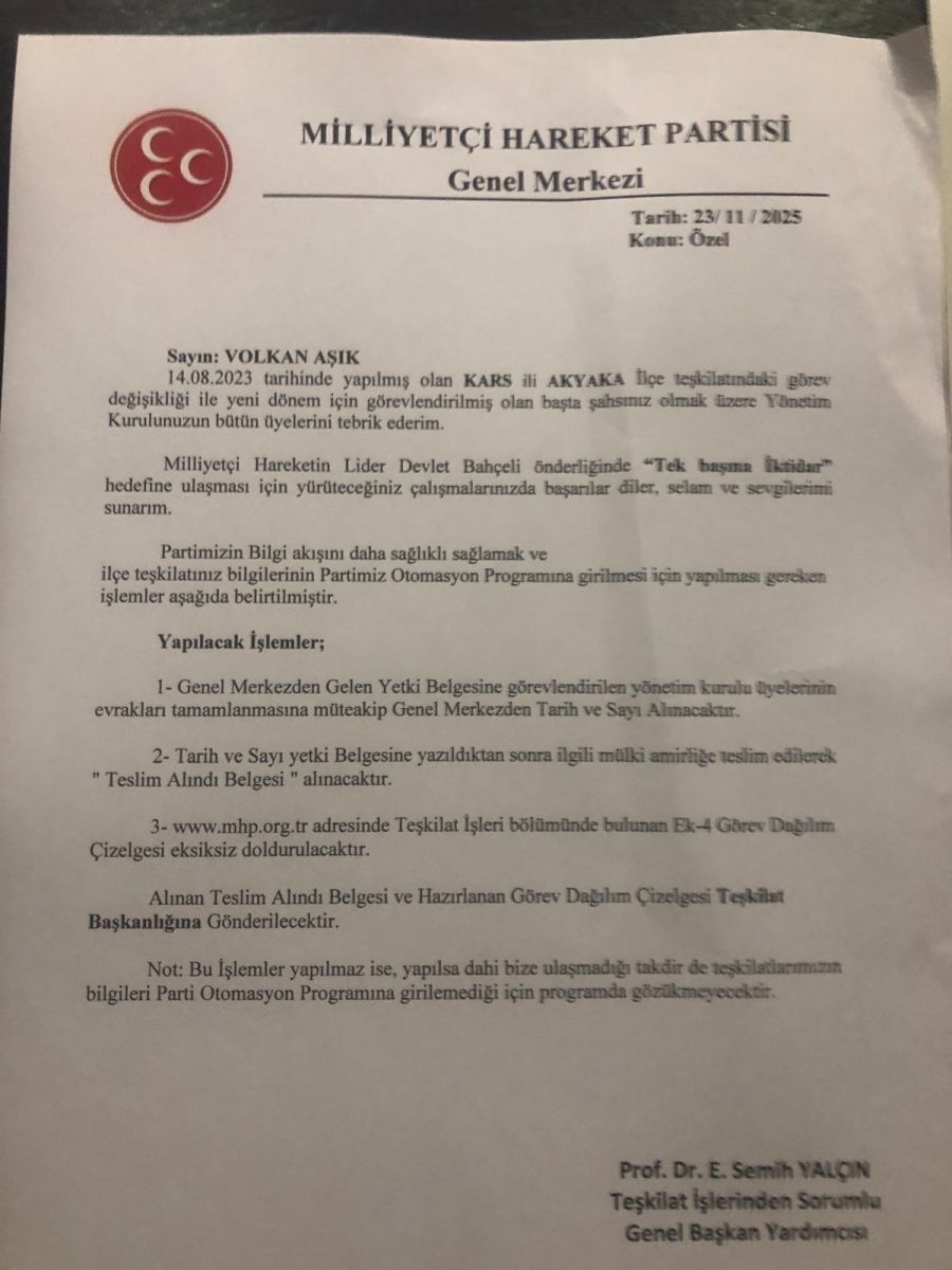 Milliyetçi Hareket Partisi (MHP) Akyaka İlçe Teşkilatı’nda önemli bir görev değişimi gerçekleşti. Önceki dönem ilçe başkanının görevden alınmasının ardından boşalan koltuğa, partinin yetkili kurullarınca yapılan değerlendirmeler sonucu Volkan Aşık atandı.
