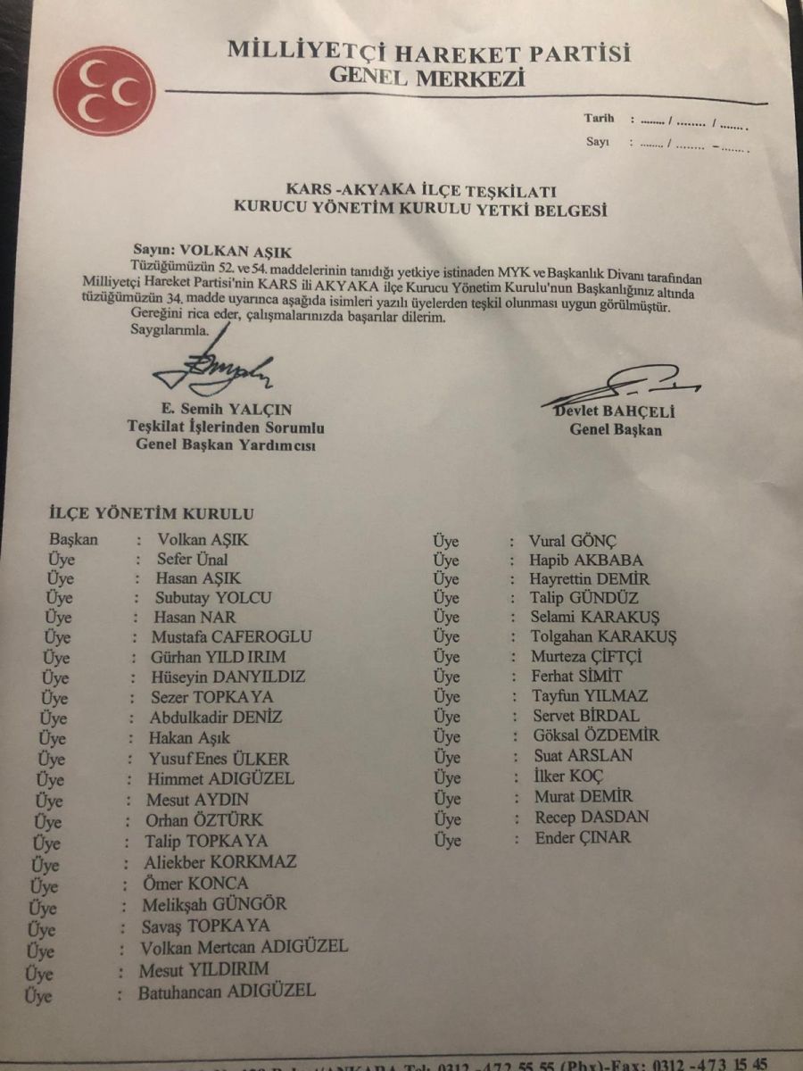 Genel Merkez tarafından yapılan inceleme ve değerlendirmeler sonucunda ise MHP Genel Başkanı Devlet Bahçeli’nin tensipleri ve Teşkilatlardan Sorumlu Genel Başkan Yardımcısı E. Semih Yalçın’ın olurları ile Volkan Aşık resmen MHP Akyaka İlçe Başkanlığı’na atandı.