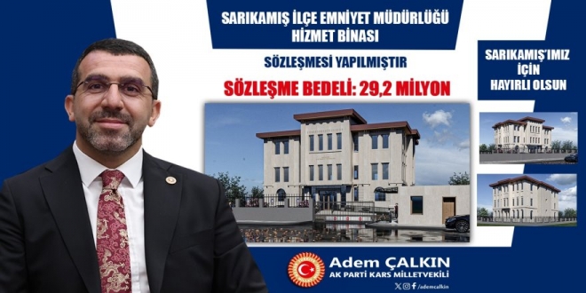 Kars Ak Parti Milletvekili Adem Çalkın, Sarıkamış ilçesi Emniyet Müdürlüğü hizmet binasının ihalesi yapılarak, sözleşmesinin imzalarının atıldığını söyledi.