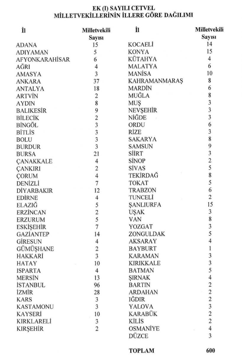 Karara göre, Türkiye genelindeki illerin nüfus verileri esas alınarak milletvekili dağılımı güncellendi. Türkiye İstatistik Kurumu’nun (TÜİK) açıkladığı son nüfus verileri doğrultusunda yapılan hesaplamalar sonucunda bazı illerin çıkaracağı milletvekili sayısında artış yaşanırken, bazı illerde ise azalma oldu.