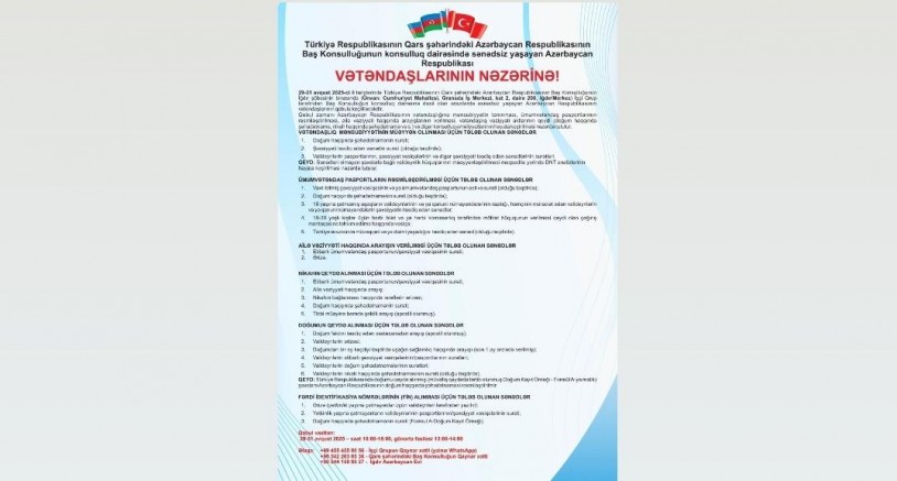 Azerbaycan Cumhuriyeti Hükümeti tarafından onaylanan ilgili Eylem Planının uygulanması amacıyla oluşturulan Çalışma Grubu tarafından, 29-31 Ağustos 2025 tarihlerinde Azerbaycan Kars Başkonsolosluğu’nun Iğdır Şubesi binasında (Adres: Cumhuriyet Mahallesi, Granada İş Merkezi, Kat 2, Daire 208, Iğdır/Merkez), Başkonsolosluğun konsolosluk bölgesinde belgeleri bulunmayan Azerbaycan Cumhuriyeti vatandaşlarının başvuruları alınacak.