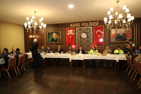 Kars Polisevi'ndeki iftar programına Vali Ziya Polat, İl Emniyet Müdürü Mehmet Ömür Saka, Jandarma Alay Komutanı Albay Fatih Cemal Kiper ve Emniyet mensupları katıldılar.
