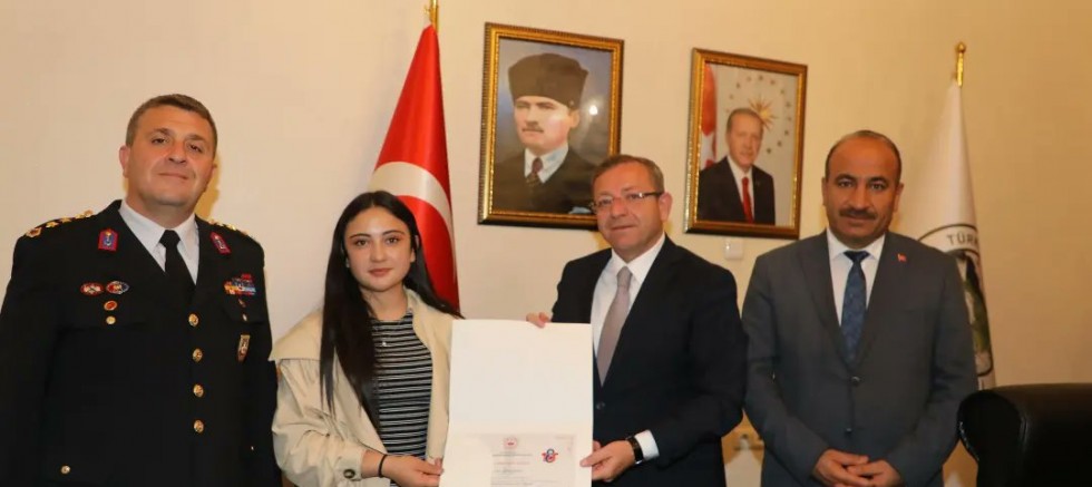 Vali Ziya Polat, Jandarma Genel Komutanlığınca Jandarma Teşkilatı'nın 185. kuruluş yıldönümü etkinlikleri kapsamında Türkiye genelinde düzenlenen şiir yarışmasında lise kategorisinde Türkiye 2'ncisi olan Kars Alpaslan Anadolu Lisesi öğrencisi İrem Hasar ve yarışmaya katılım sağlayan Mehmet Akif Ersoy Ortaokulu öğrencisi Fatma Uzbek'i makamında ağırlayarak, başarı belgesi ve ödülünü verdi.